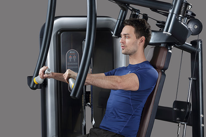 5.蝴蝶机,锻炼胸肌的好帮手,能够充分地扩展胸部肌肉,重塑胸部线条,是健美人士最爱的器材之一。
